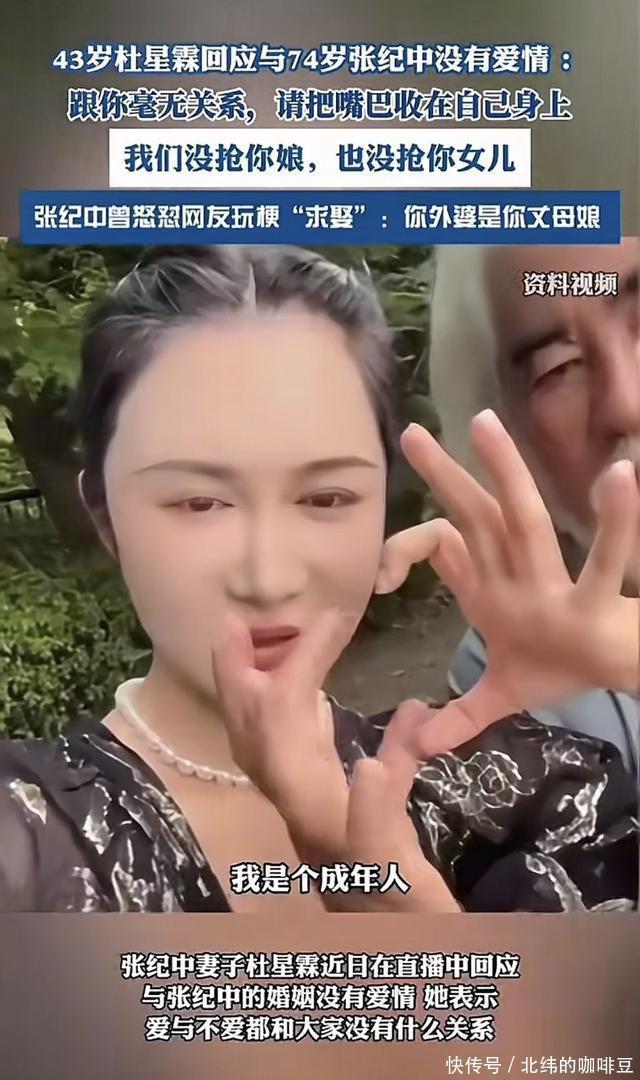 直播镜头里,杜星霖没了往常的温柔劲儿,看着满屏说她和张纪中“没爱情”的质疑,直接开怼:“我没抢你妈,也没抢你闺女,请把嘴管严实点!” 杜星霖在直播里这么硬气的回应,一下子就把全网讨论炸起来了。面对网友质疑她岁的张纪中结婚“没爱情”,她一点不软:“爱不爱是我们的事,跟旁人没关系。这是我自己的人生,我是成年人了”。